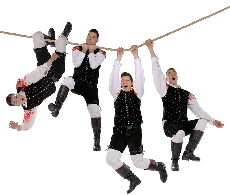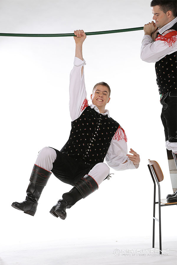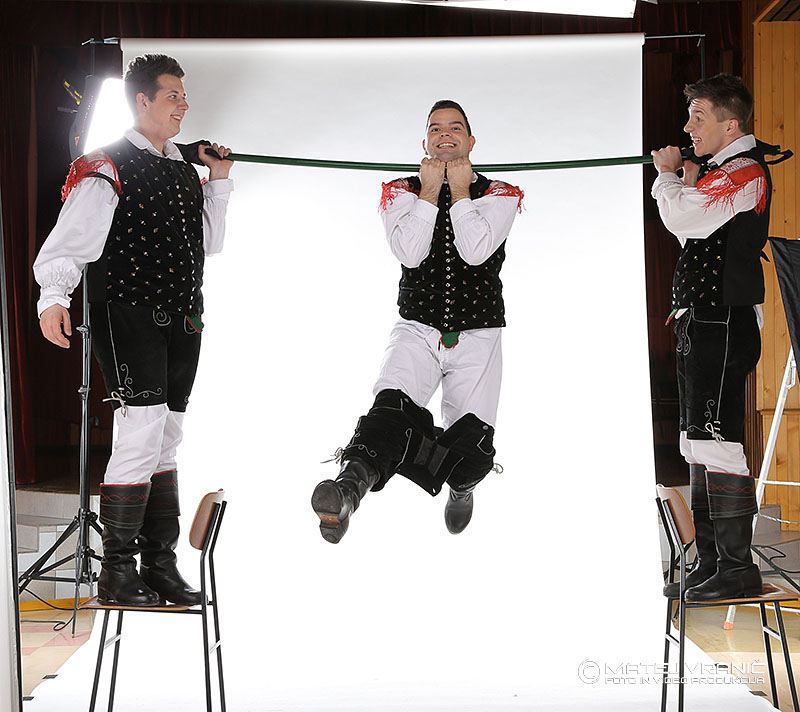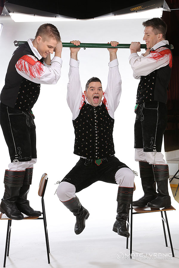 Naj bolj pa smo se zabavali ob nastajanju skupinske fotke kako fantje visijo na vrvi, ki je v resnici bila vse prej kot to. Jure in Žiga, mišičnjaka v ansamblu, sta se odločila, da bota nosilni steber za jekleno palico.