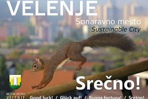 Jumbo plakat, postavljen na vpadnicah v mesto Velenje. Srečno! Good luck! Glück auf! Buona furtuna! Sretno!