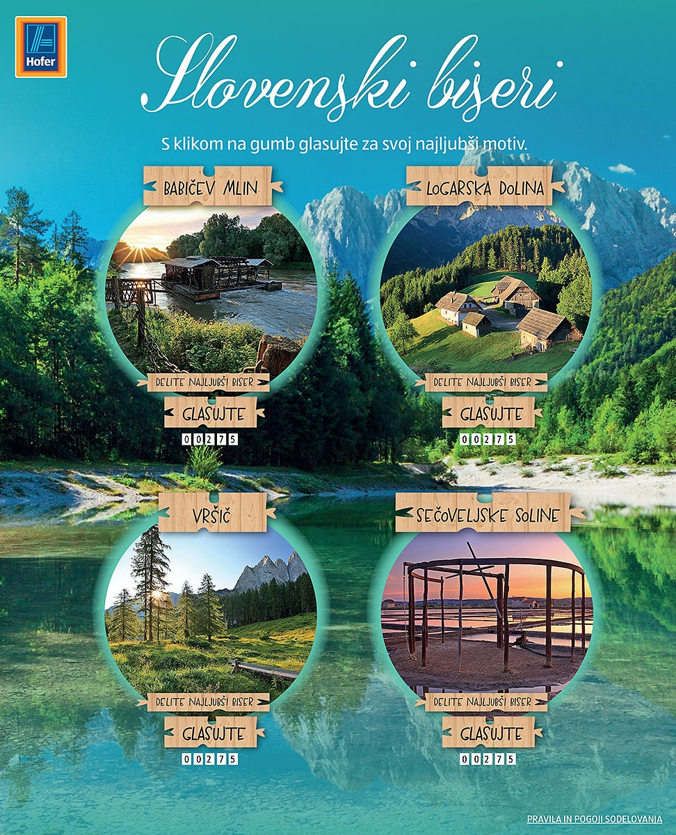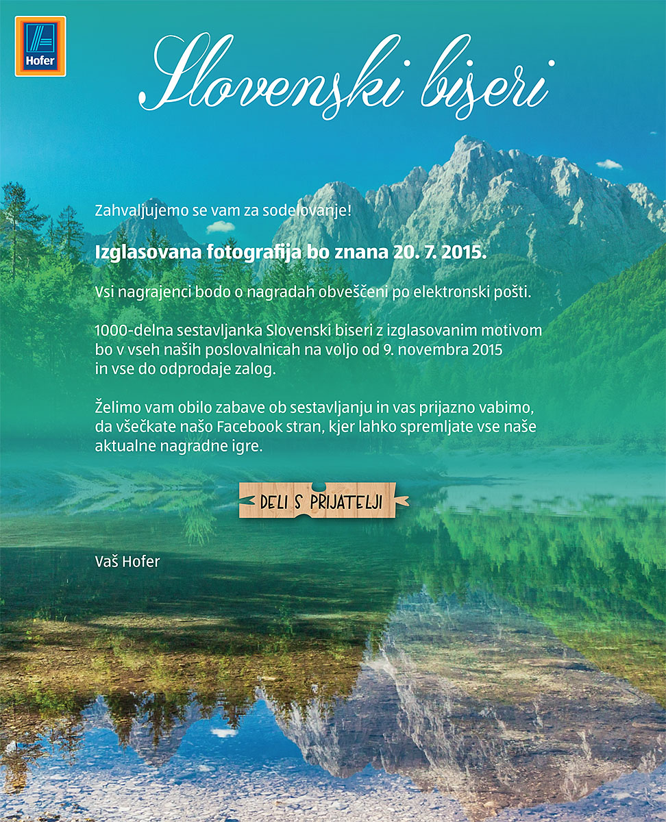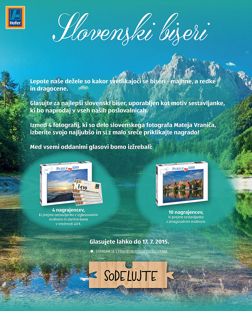 Hofer Slovenija bo ponovno izdelal nekaj sestavljank (puzzle) biserov Slovenije iz mojih fotografij. Tokrat so se odločili, da bodo preko facebooka v obliki nagradne igre z glasovanjem izbrali od štirih znamenitosti Slovenije dva zmagovalna motiva, ki ju bodo upodobili v priljubljenih sestavljankah. S klikom na ta link se lahko prijavite in sodelujete v nagradni igri, ki poteka do 17. 07. 2015, zato pohitite. V preteklih letih so že pri Hofer Slovenija izdelali sestavljanke z mojimi motivi Ljubljane, Maribora, Triglava, Soče, Bleda in Pirana.