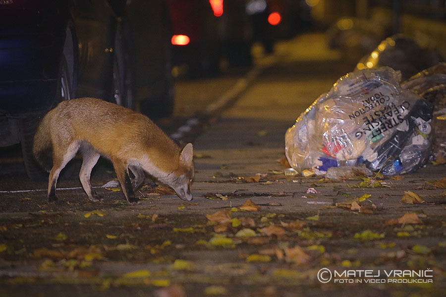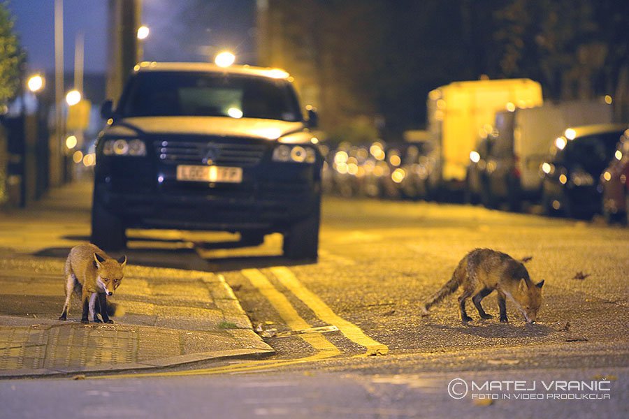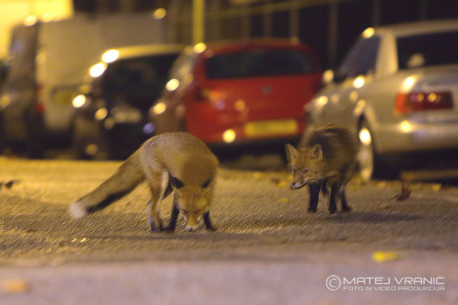 Potikal sem se naokrog in ko sem naletel na lisico, sem ji preprosto sledil in jo fotografiral. Pri čemer se ni, navajena človeške bližine, niti zdrznila. Potem pa se mi je zazdelo, da bi bilo še bolje, če bi lisice kar same prihajale k meni. Zato sem že naslednjo noč na primerno mesto nastavil nekaj mačje hrane in počakal na njihov prihod. Prihajale so skoraj tako, kot prihajamo ljudje k zobozdravniku, na vsakih 20 minut ali pol ure, nekatere posamič, včasih v paru. Paritvena sezona se začne tu decembra, lisica pa je godna samo tri dni in samci te priložnosti nočejo zamuditi. Pri čemer ni obnašanje mestnih lisjakov nič drugačno kot pri njihovih v naravnem okolju živečih bratih. Na ulici so se med njimi vnemali srditi ravsi, med katerimi so tekmeci švigali gor in dol po cesti pa med smetiščnimi kantami, skakali po avtih in betonskih ograjah … Cvilili so in bevskali ter povzročali glasen ropot. Kakšen trušč so uganjali, pove primerjava z gonečimi se mačkoni – lisjaki so bili v svoji ženitni norosti še veliko glasnejši. Ker sem imel ta ples priložnost videti prvič tako od blizu, so me bile same oči. Jezilo pa me je, da mi nikakor ni uspelo napraviti dobre fotografije tega nočnega cirkusa. Svetloba je bila preslaba, dogajanje pa tako hitro, da sem mu celo s pogledom včasih le težko sledil.