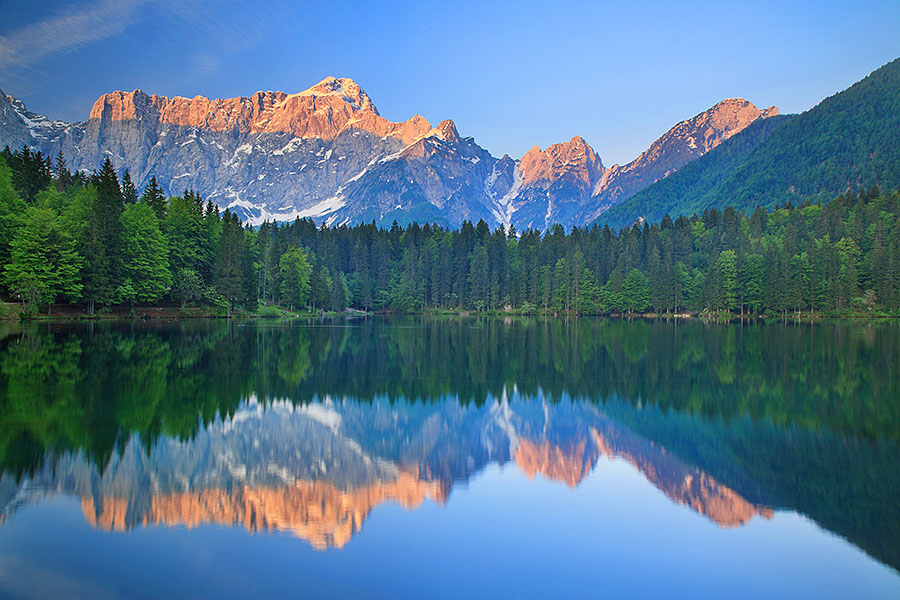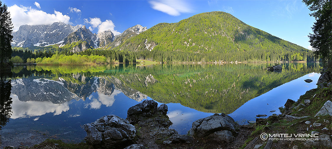 Spodnje Mangartsko ali Belopeško jezero v katerem se zrcalijo Mangart, Mali Mangart, Travnik, Male špice in Monte Buconin.
