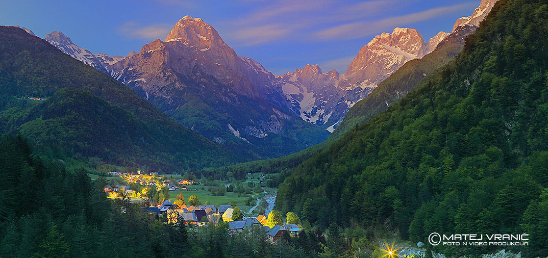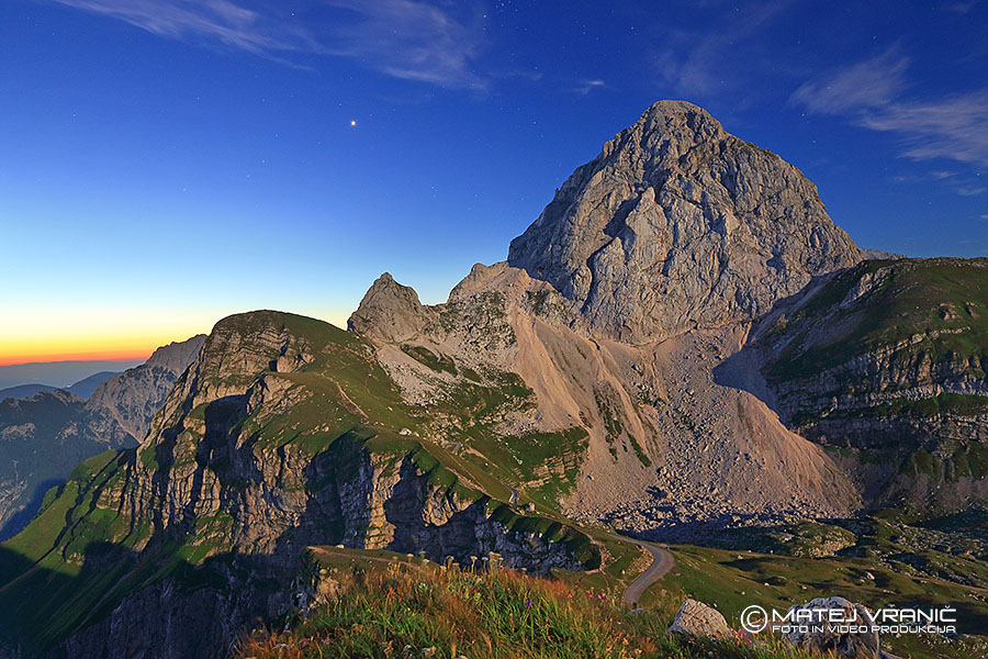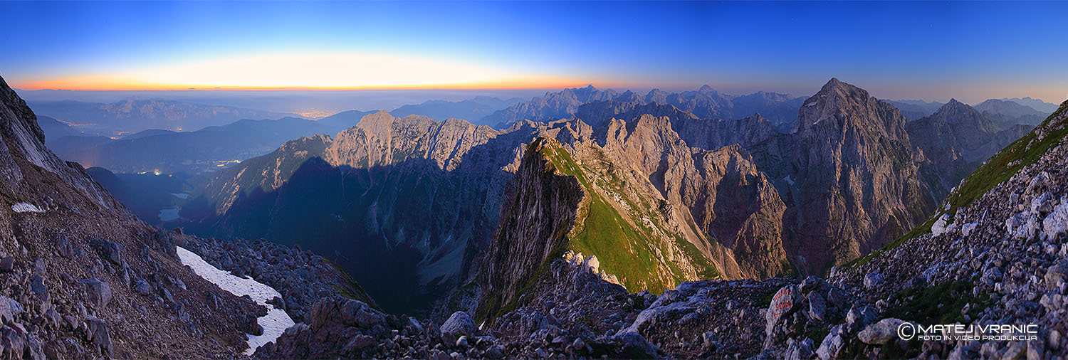 Razgled proti vzhodu s poti na Mangart, kjer se sonce že počasi prebuja. Na zahodu še vedno sveti polna luna, ki osvetljuje vršace.