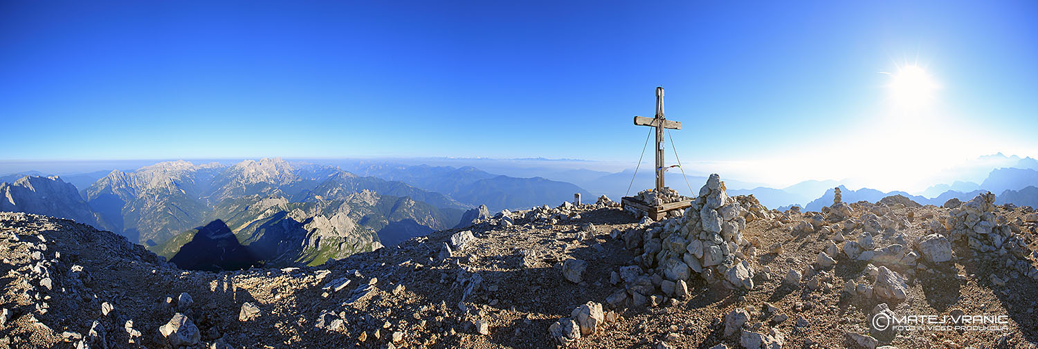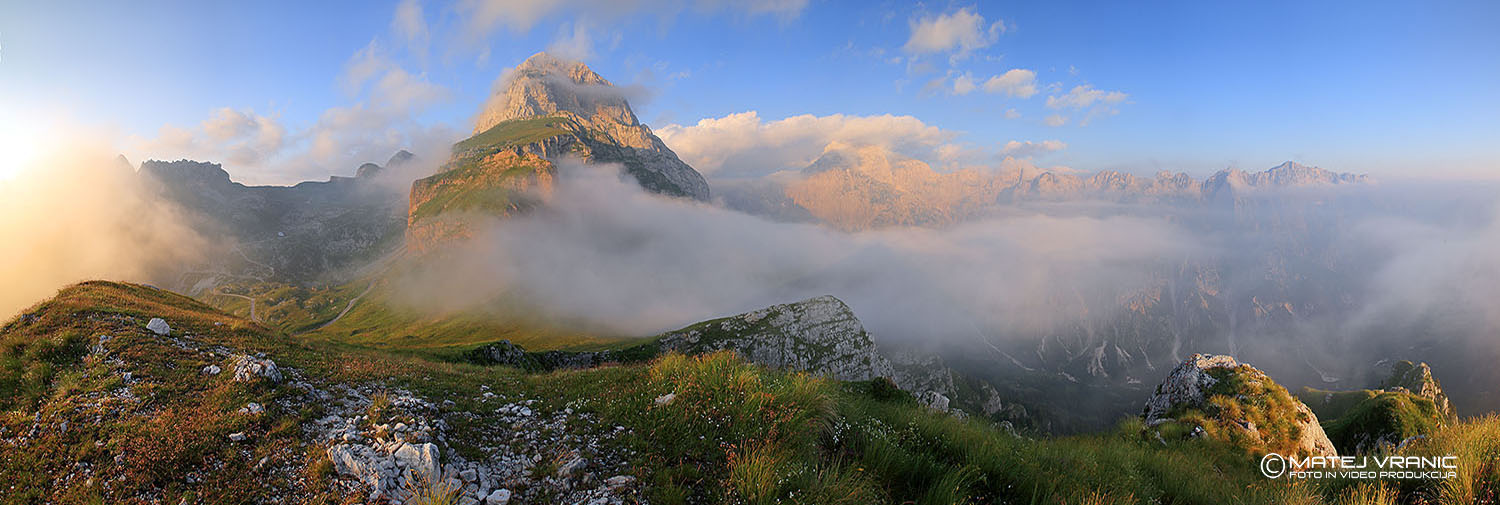 Panoramski pogled na Rdečo skalo, Mangart in okolico z Malega vrha. Na desni strani se v meglice zavijajo Jalovec, Pelc nad Klonicami in Loška stena.